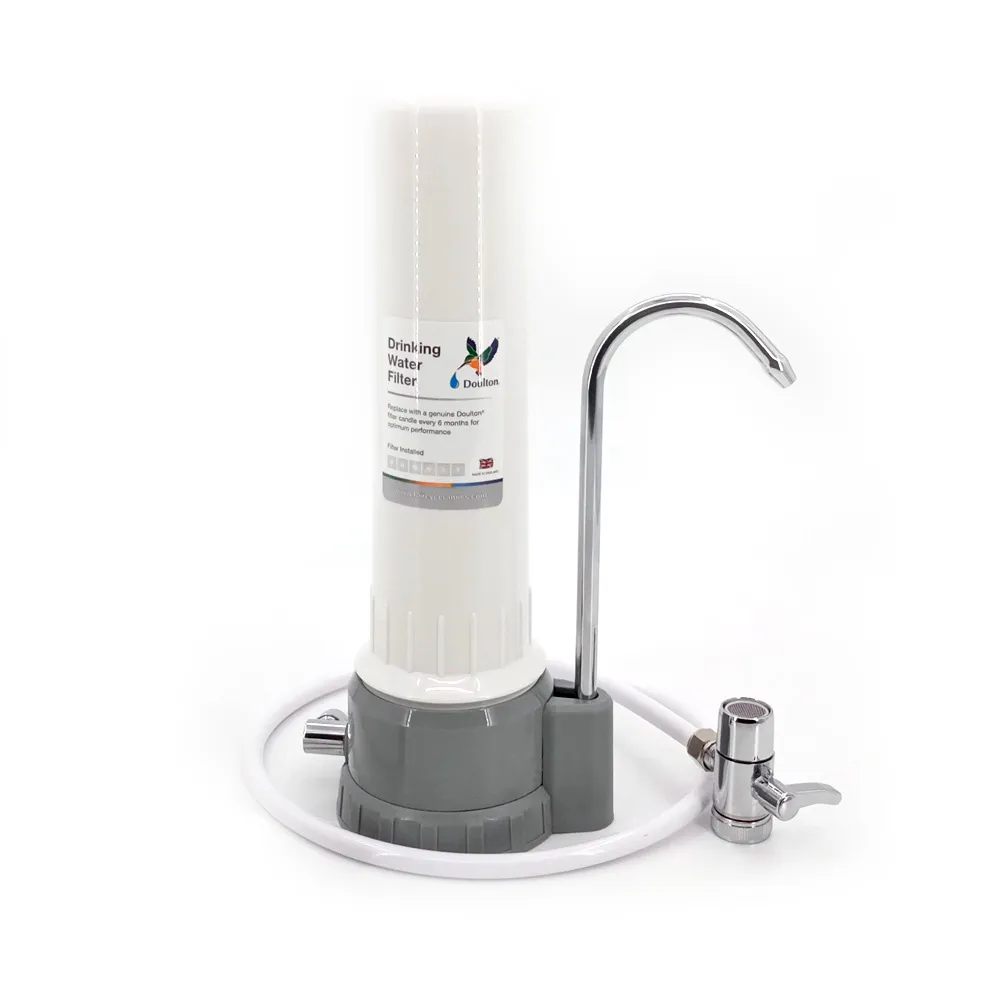 Λευκό σύστημα φίλτρανσης νερού άνω πάγκου με βρυσάκι που συνδέεται με την βρύση της κουζίνας. Το σύστημα περιλαμβάνει το φίλτρο νερού Doulton Ultracarb. Η Doulton HCPS είναι μια μονή, κομψή συσκευή φίλτρου άνω πάγκου με το αξιόπιστο φίλτρο Ultracarb, ιδανική για όσους αναζητούν άμεση, αποτελεσματική και ασφαλή φίλτρανση νερού απευθείας από τη βρύση. Κατασκευασμένη στο Ηνωμένο Βασίλειο, με κορυφαίες πιστοποιήσεις NSF & WRAS, εγγυάται καθαρό και νόστιμο πόσιμο νερό, απομακρύνοντας χλώριο, βαρέα μέταλλα, βακτήρια και άλλες βλαβερές ουσίες.